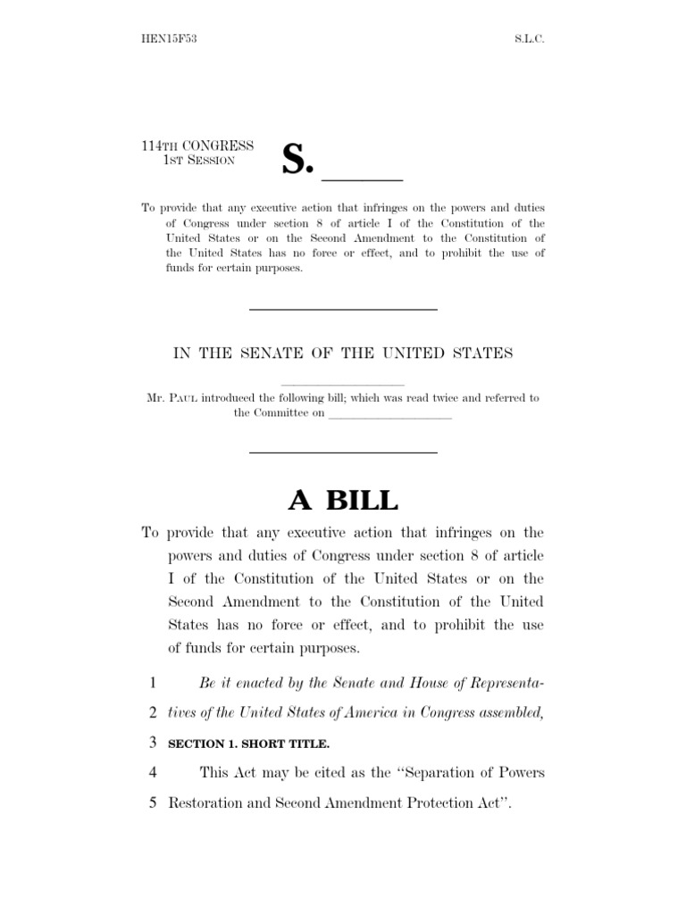 To provide that any executive action that infringes on the powers and duties of Congress under section 8 of article I of the Constitution of the United States or on the Second Amendment to the Constitution of the United States has no force or effect, and to prohibit the use of funds for certain purposes.