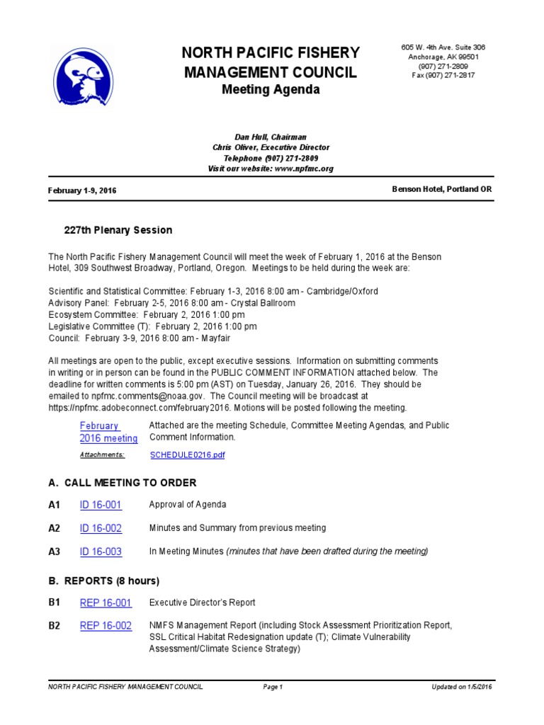 The North Pacific Fishery Management Council will meet the week of February 1, 2016 at the Benson
