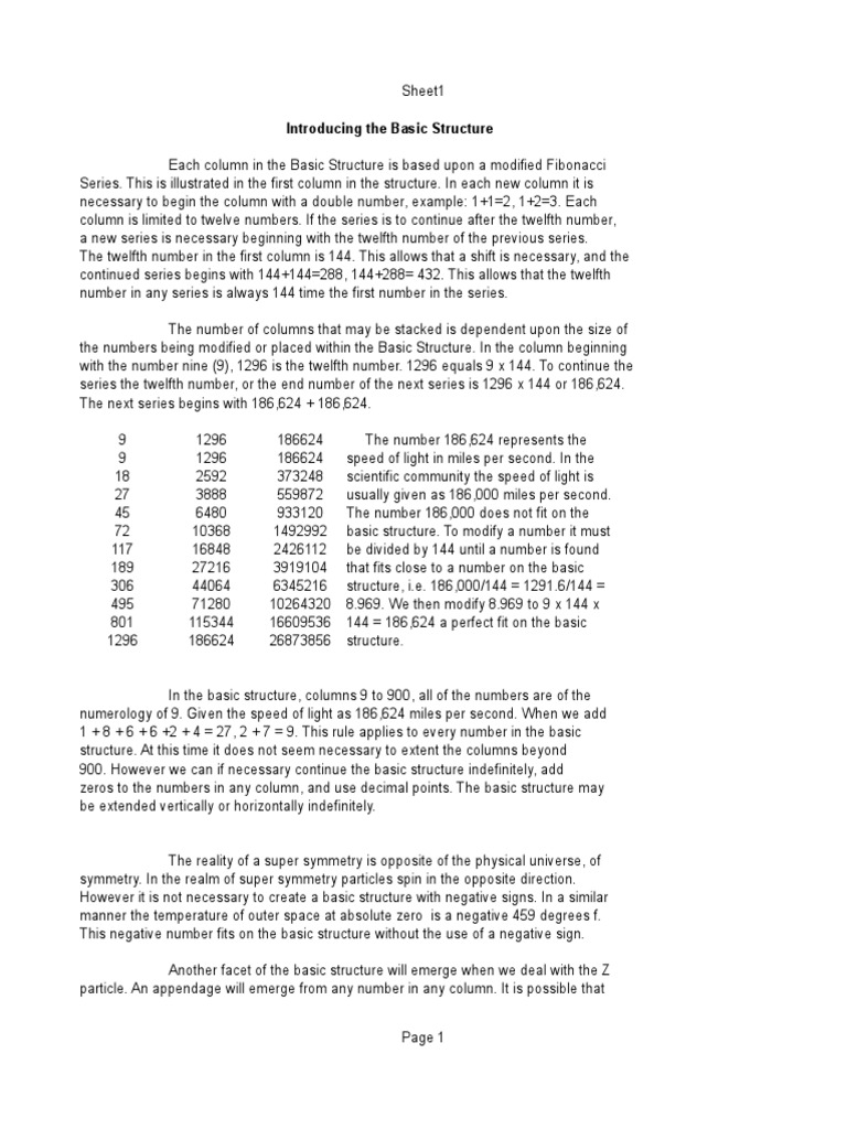 Each column in the Basic Structure is based upon a modified FibonacciSeries. This is illustrated in the first column in the structure. In each new column it isnecessary to begin the column with a double number, example: 1+1=2, 1+2=3. Eachcolumn is limited to twelve numbers. If the series is to continue after the twelfth number,a new series is necessary beginning with the twelfth number of the previous series. The twelfth number in the first column is 144. This allows that a shift is necessary, and the continued series begins with 144+144=288, 144+288= 432. This allows that the twelfthnumber in any series is always 144 time the first number in the series.The number of columns that may be stacked is dependent upon the size of the numbers being modified or placed within the Basic Structure. In the column beginningwith the number nine (9), 1296 is the twelfth number. 1296 equals 9 x 144. To continue theseries the twelfth number, or the end number of the next series is 1296 x 144 or 186,624.The next series begins with 186,624 + 186,624.91296186624 The number 186,624 represents the91296186624speed of light in miles per second. In the182592373248scientific community the speed of light is273888559872usually given as 186,000 miles per second.456480933120The number 186,000 does not fit on the72103681492992basic structure. To modify a number it must117168482426112be divided by 144 until a number is found189272163919104that fits close to a number on the basic 306440646345216structure, i.e. 186,000/144 = 1291.6/144 =49571280102643208.969. We then modify 8.969 to 9 x 144 x80111534416609536144 = 186,624 a perfect fit on the basic129618662426873856structure.In the basic structure, columns 9 to 900, all of the numbers are of thenumerology of 9. Given the speed of light as 186,624 miles per second. When we add1 + 8 + 6 + 6 +2 + 4 = 27, 2 + 7 = 9. This rule applies to every number in the basicstructure. At this time it does not seem necessary to extent the columns beyond900. However we can if necessary continue the basic structure indefinitely, add zeros to the numbers in any column, and use decimal points. The basic structure maybe extended vertically or horizontally indefinitely.The reality of a super symmetry is opposite of the physical universe, of symmetry. In the realm of super symmetry particles spin in the opposite direction.However it is not necessary to create a basic structure with negative signs. In a similar manner the temperature of outer space at absolute zero is a negative 459 degrees f.This negative number fits on the basic structure without the use of a negative sign. Another facet of the basic structure will emerge when we deal with the Zparticle. An appendage will emerge from any number in any column. It is possible that