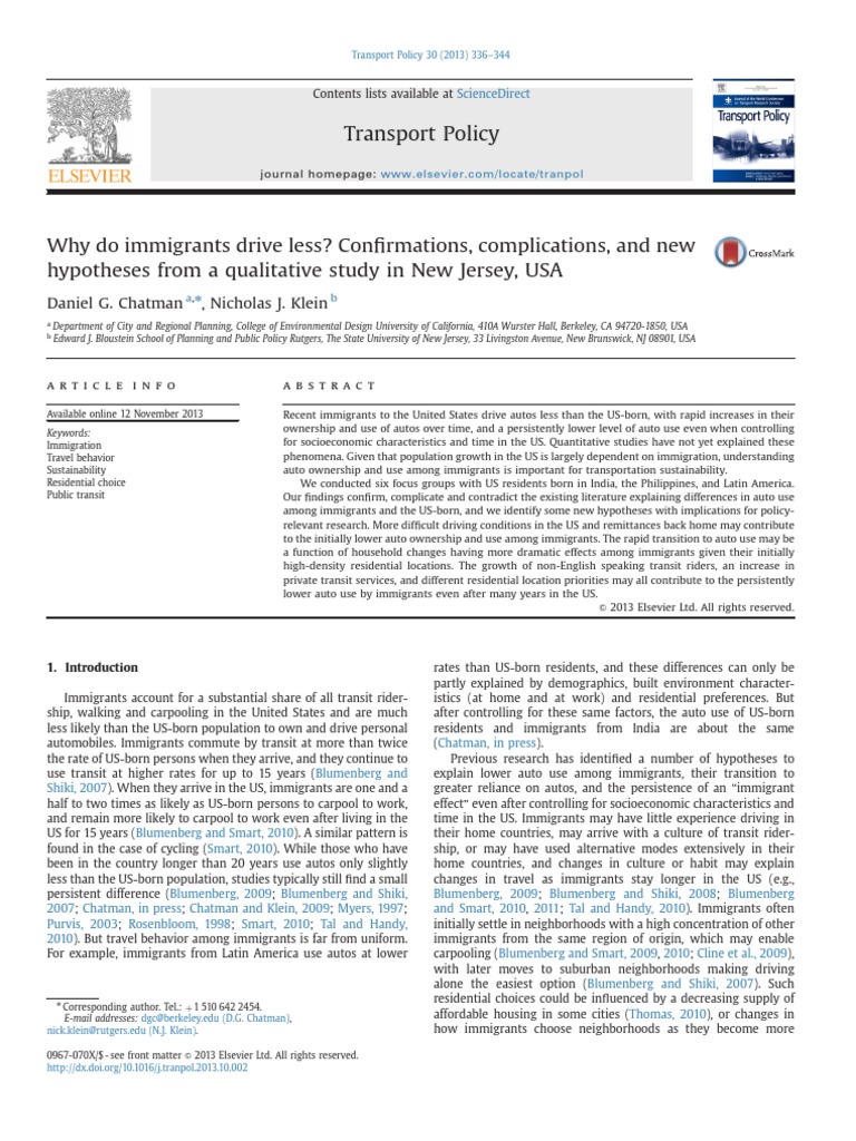 Chatman, D.G., 2013. Explaining the immigrant effect on auto use: the inuences