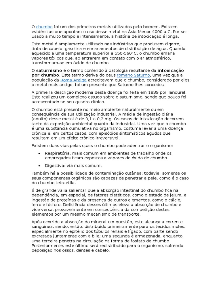 O Chumbo extremamente txico ao organismo se exposto em doses