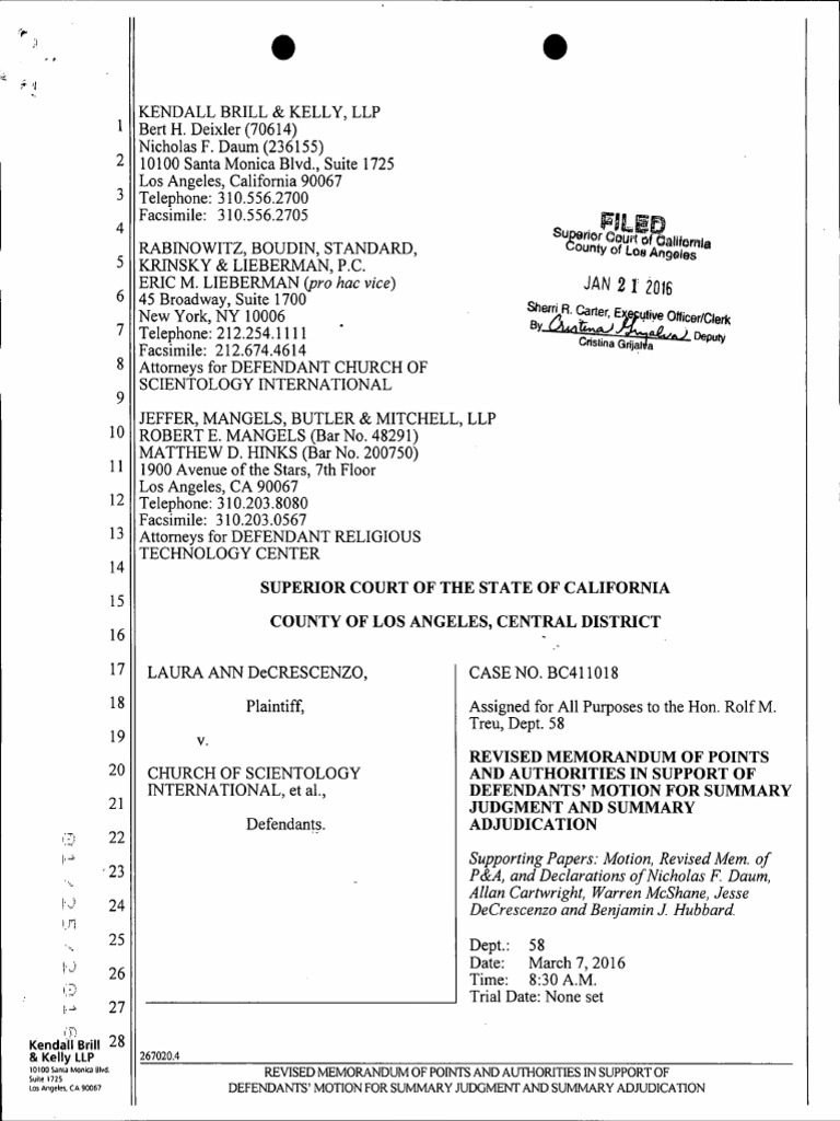 DeCrescenzo vs. Scientology: Revised Memo of Points and Authorities