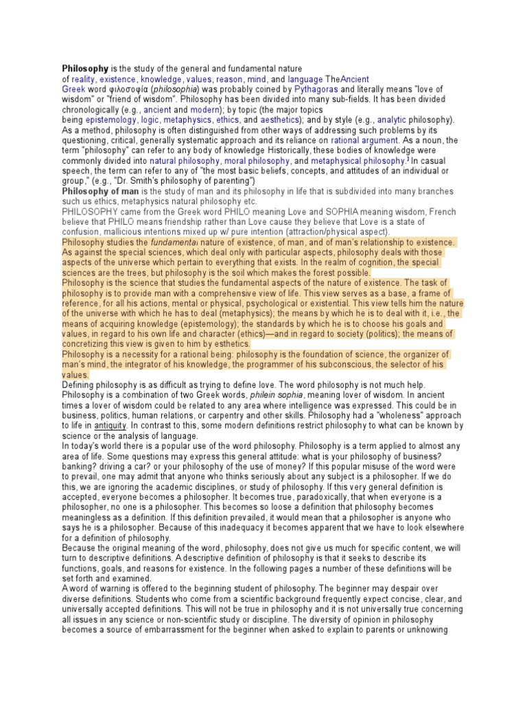 Philosophy studies the fundamental nature of existence, of man, and of mans relationship to existence.