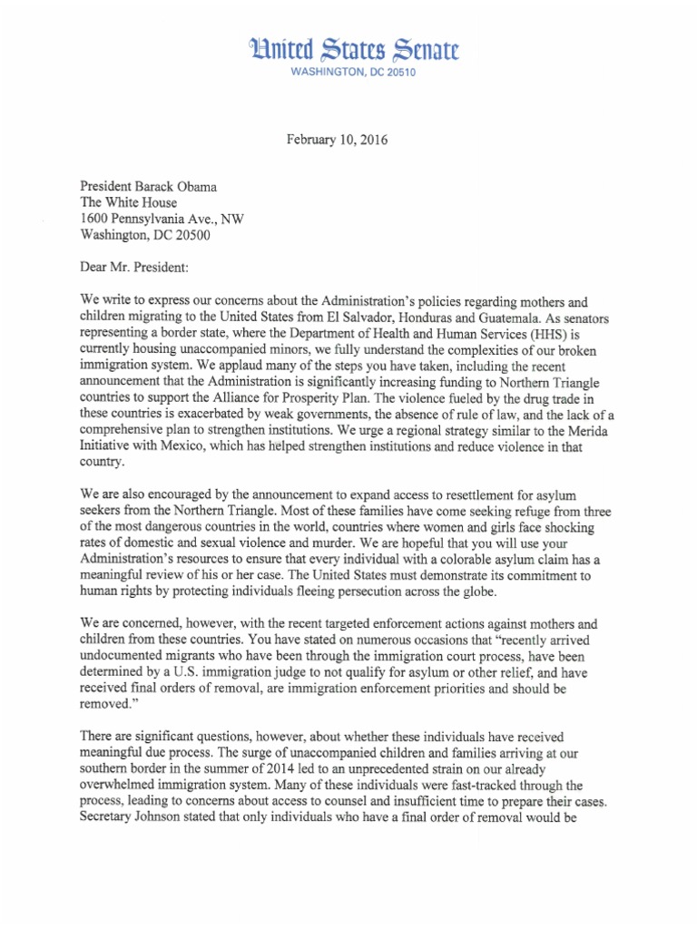 In a letter to President Obama, Senators Tom Udall and Martin Heinrich urged him to suspend immigration removal actions against Central American families until concerns about due process can be resolved.