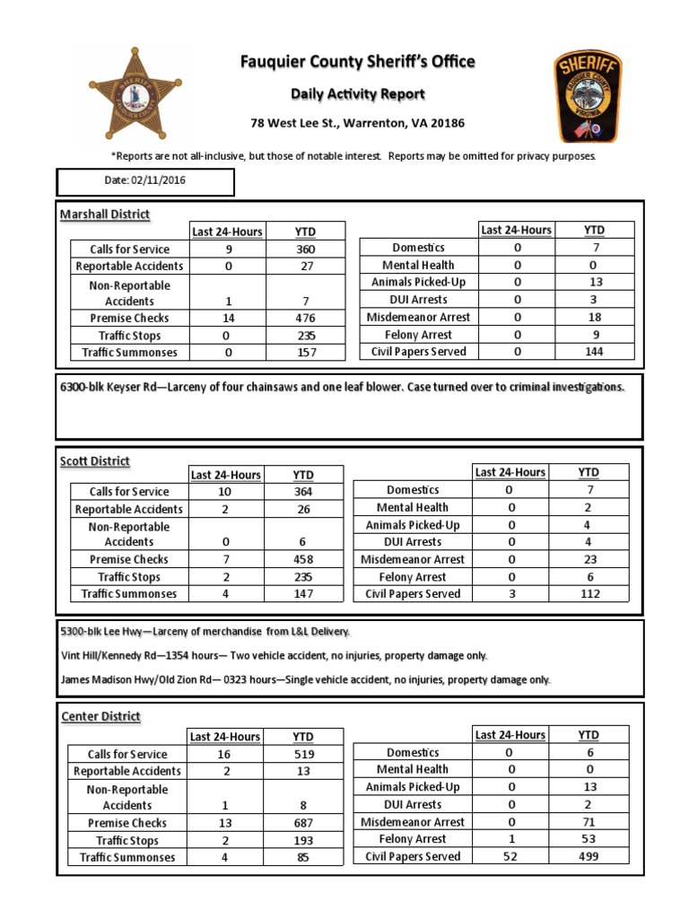 Vint Hill/Kennedy Rd1354 hours Two vehicle accident, no injuries, property damage only.