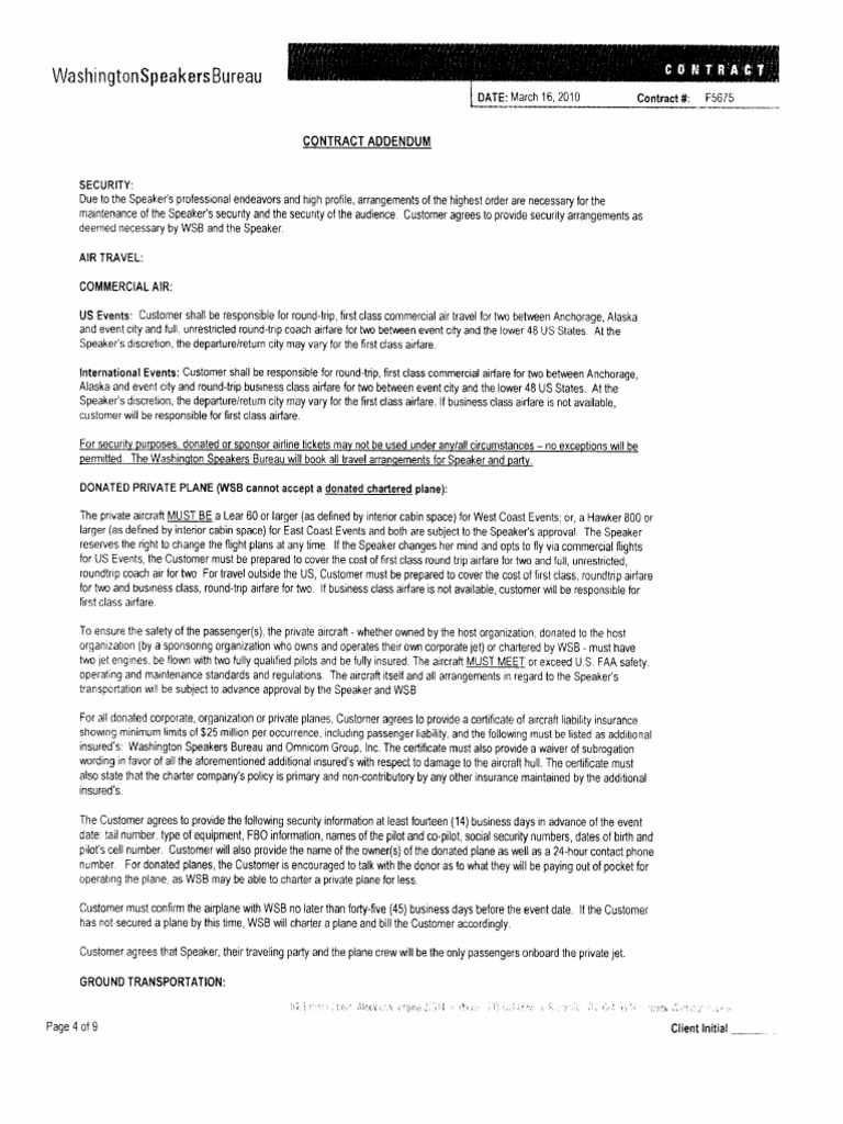 Customer agrees to provide security arrangements as deemed necessary by WSB and The Speaker. For security purposes. Donated or sponsor airline tickets may not be used under any / all circumstances. The Speaker reserves the right to change the flight plans at any time.