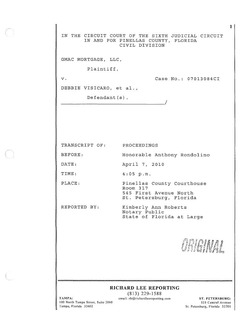 THE COURT: Okay, we are here today in GMAC v Visicaro. This is a motion for rehearing the previously drafted motion for summary judgement...