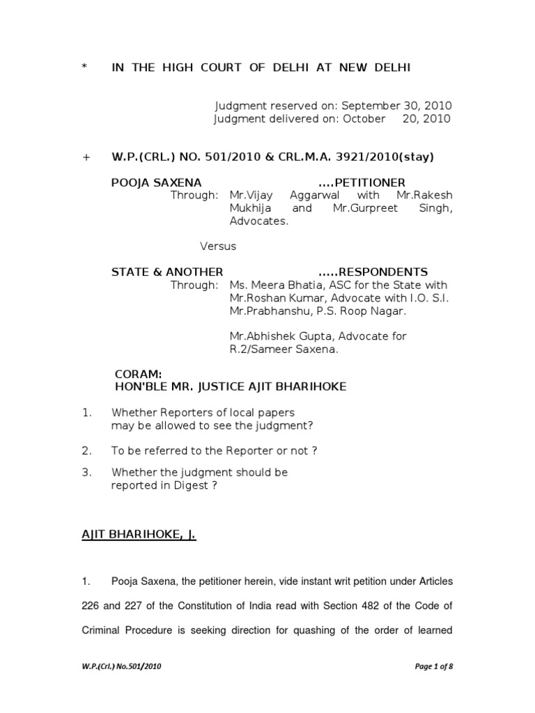 petitioner Pooja Saxena filed a complaint of dowry demand and harassment