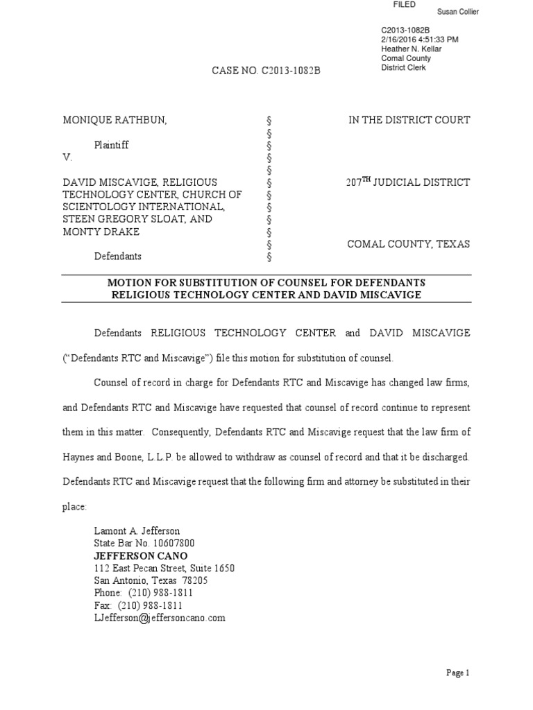 Defendants RELIGIOUS TECHNOLOGY CENTER and DAVID MISCAVIGE (“Defendants RTC and Miscavige”) file this motion for substitution of counsel. Counsel of record in charge for Defendants RTC and Miscavige has changed law firms, and Defendants RTC and Miscavige have requested that counsel of record continue to represent them in this matter. Consequently, Defendants RTC and Miscavige request that the law firm of Haynes and Boone, L.L.P. be allowed to withdraw as counsel of record and that it be discharged. Defendants RTC and Miscavige request that the following firm and attorney be substituted in their place: Lamont A. Jefferson State Bar No. 10607800