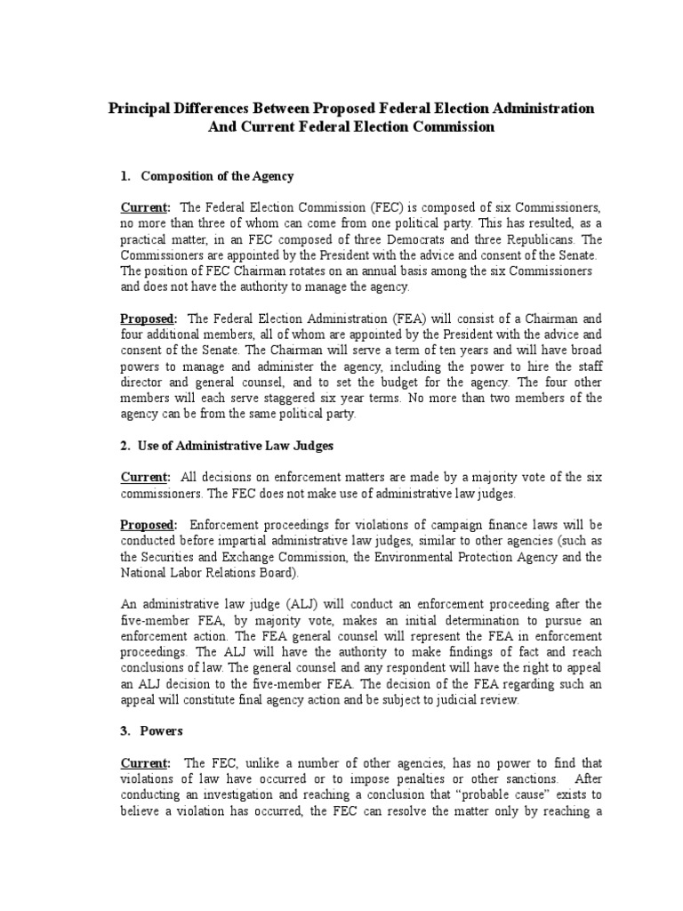 Principal Differences Between Proposed Federal Election AdministrationAnd Current Federal Election Commission
