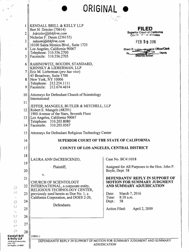 DeCrescenzo v. Scientology: Defendant Reply