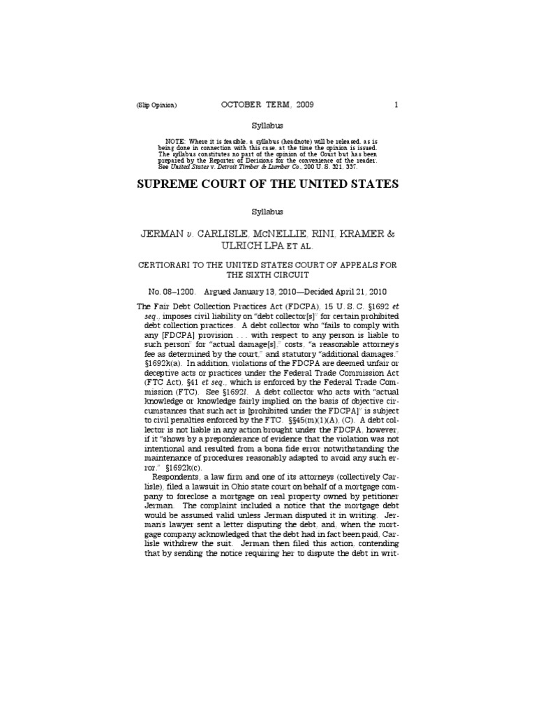 . A debt collector who acts with “actual knowledge or knowledge fairly implied on the basis of objective cir-cumstances that such act is [prohibited under the FDCPA]” is subjectto civil penalties enforced by the FTC. §§45(m)(1)(A), (C). A debt col-lector is not liable in any action brought under the FDCPA, however, if it “shows by a preponderance of evidence that the violation was not intentional and resulted from a bona fide error notwithstanding the maintenance of procedures reasonably adapted to avoid any such er-ror.” §1692k(c). Respondents, a law firm and one of its attorneys (collectively Car-lisle), filed a lawsuit in Ohio state court on behalf of a mortgage com-pany to foreclose a mortgage on real property owned by petitionerJerman. The complaint included a notice that the mortgage debt would be assumed valid unless Jerman disputed it in writing. Jer-man’s lawyer sent a letter disputing the debt, and, when the mort-gage company acknowledged that the debt had in fact been paid, Car-lisle withdrew the suit. Jerman then filed this action, contending that by sending the notice requiring her to dispute the debt in writ-