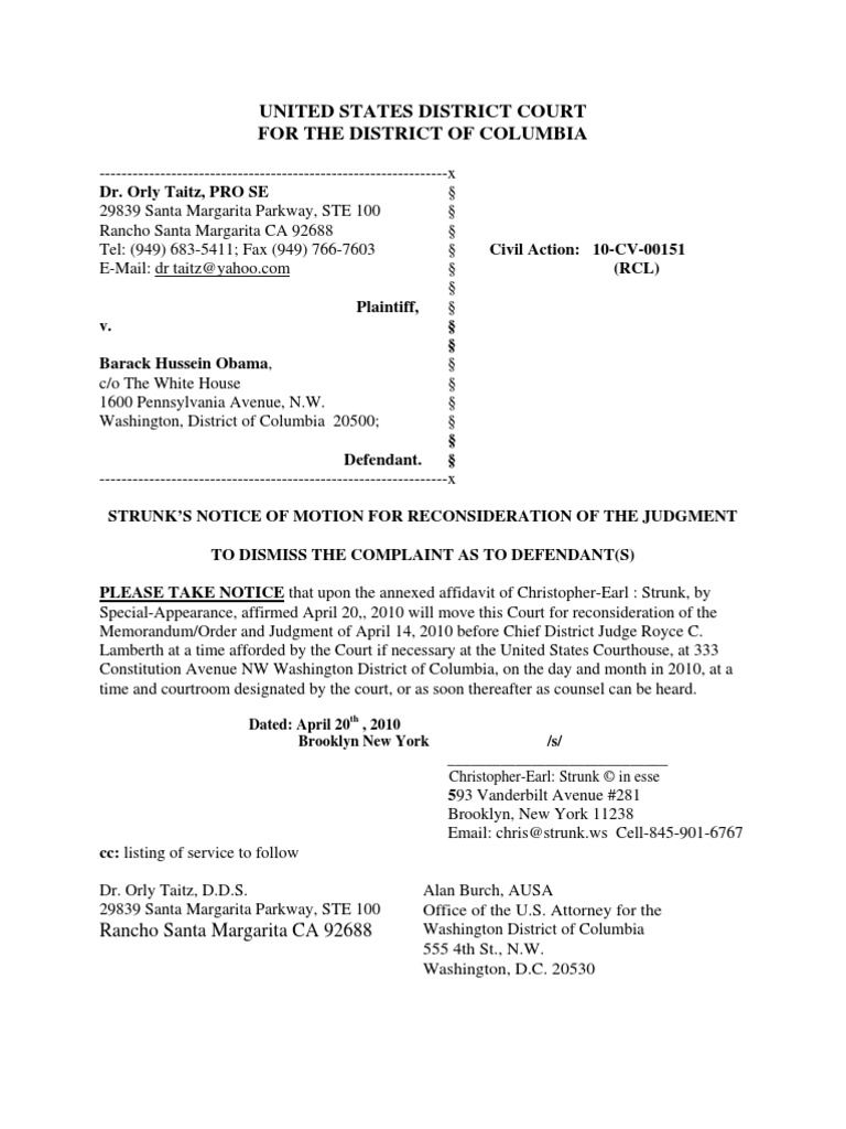 that upon the annexed affidavit of Christopher-Earl : Strunk, by Special-Appearance, affirmed April 20,, 2010 will move this Court for reconsideration of the Memorandum/Order and Judgment of April 14, 2010 before Chief District Judge Royce C. Lamberth at a time afforded by the Court if necessary at the United States Courthouse, at 333 Constitution Avenue NW Washington District of Columbia, on the day and month in 2010, at a time and courtroom designated by the court, or as soon thereafter as counsel can be heard.