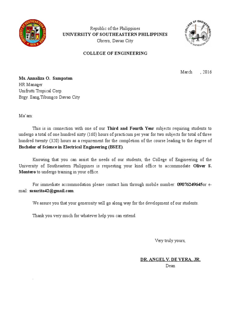 Engineering at the University of Southeastern Philippines and am writing to apply for an On the