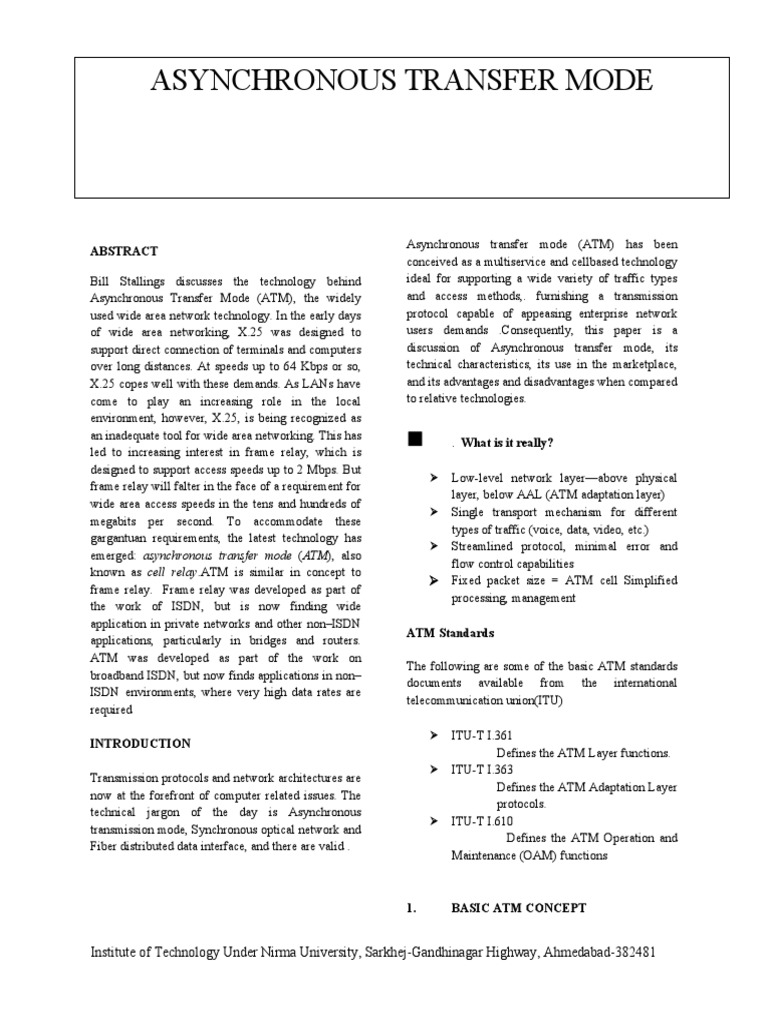 Asynchronous Transfer Mode (ATM), the widely and access methods,. furnishing a transmission