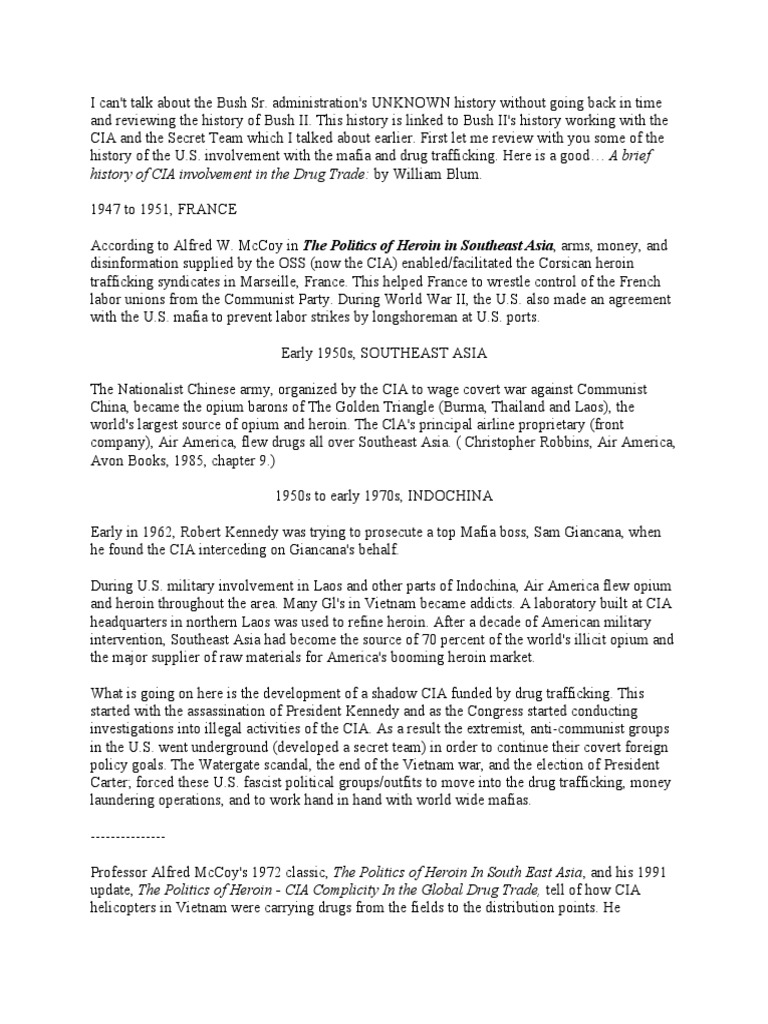The document provides a lengthy summary of CIA involvement in drug trafficking from the 1940s-1970s. It details how the CIA worked with Corsican heroin syndicates in France in the 1940s-1950…