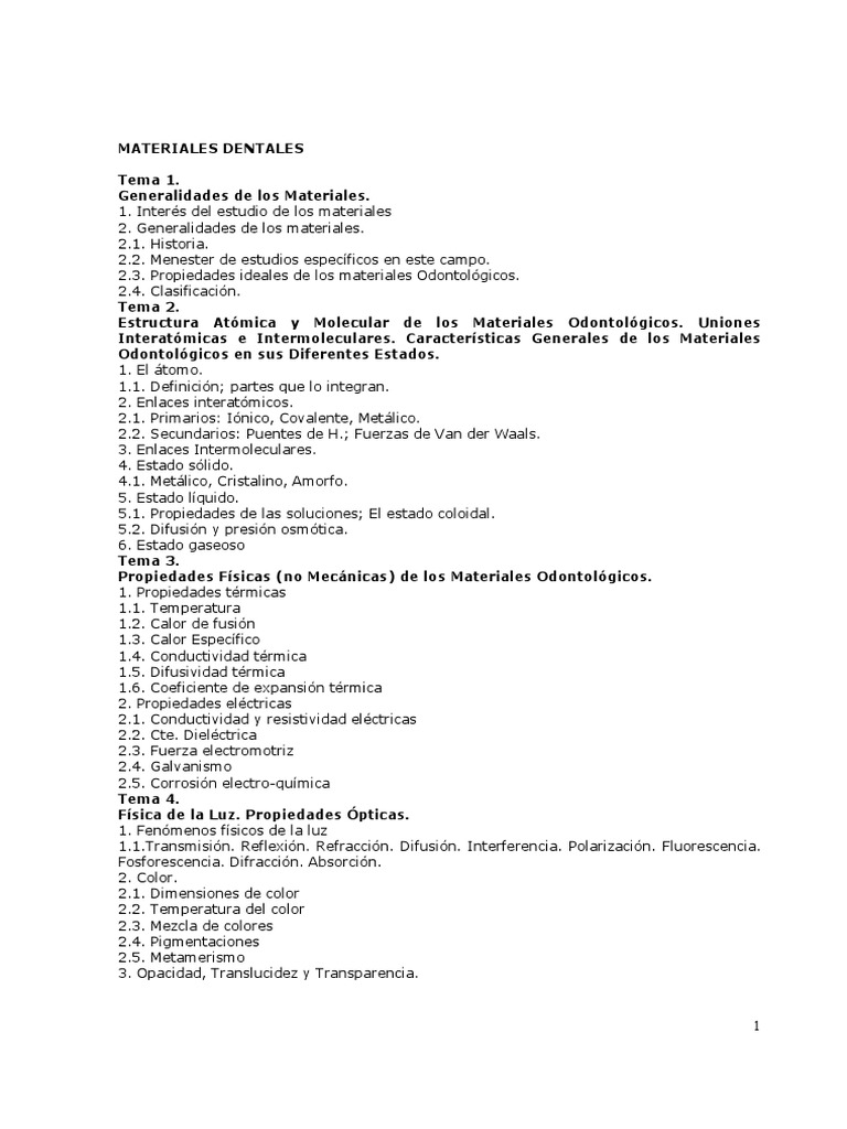 Propiedades 3. Propiedades mecánicas 8. Composición 2. 1. Usos principales 4. Propiedades generales 2. Usos 5. Tipos 4. Materiales de Impresión no Elásticos. Absorción de agua 5. Materiales de Impresión Elásticos: Hidrocoloides. 1. Composición 2.3. características. 1. Porosidad 6. Consideraciones técnicas Tema 16. Propiedades generales 3. Consideraciones biológicas y clínicas 3. Polimerización por adición 3. Polimerización por condensación 2. Composición 2. Contracción de polimerización 4. Ceras Dentales y otros Compuestos Termoplasticos. Propiedades 3. Composición de las ceras 2. Hidrocoloides reversibles (composición. Estudio de su desarrollo y clasificación 3. Composición y Clasificación. propiedades y manipulación) 4. Aplicaciones clínicas 4 . Períodos de polimerización Tema 15. Tipos 4. Composición. Resinas Compuestas. Uso Elastómeros Sintéticos 1. Consideraciones biológicas y clínicas 3. propiedades y manipulación) 5. Mecanismos de Polimerización. Otros tipos de polimerización 4. Usos odontológicos Pasta Cinquenólica 1. Resistencia a la presión 7. Consideraciones biológicas y clínicas 4. características.4. Usos odontológicos Tema 17. Propiedades Tema 14. propiedades generales y clasificación 2. Polímetros Acrílicos (Resinas) 1. Color 9. Otros materiales poliméricos naturales o artificiales Tema 18.Hidrocoloides irreversibles (composición. Clasificación 5. 1.
