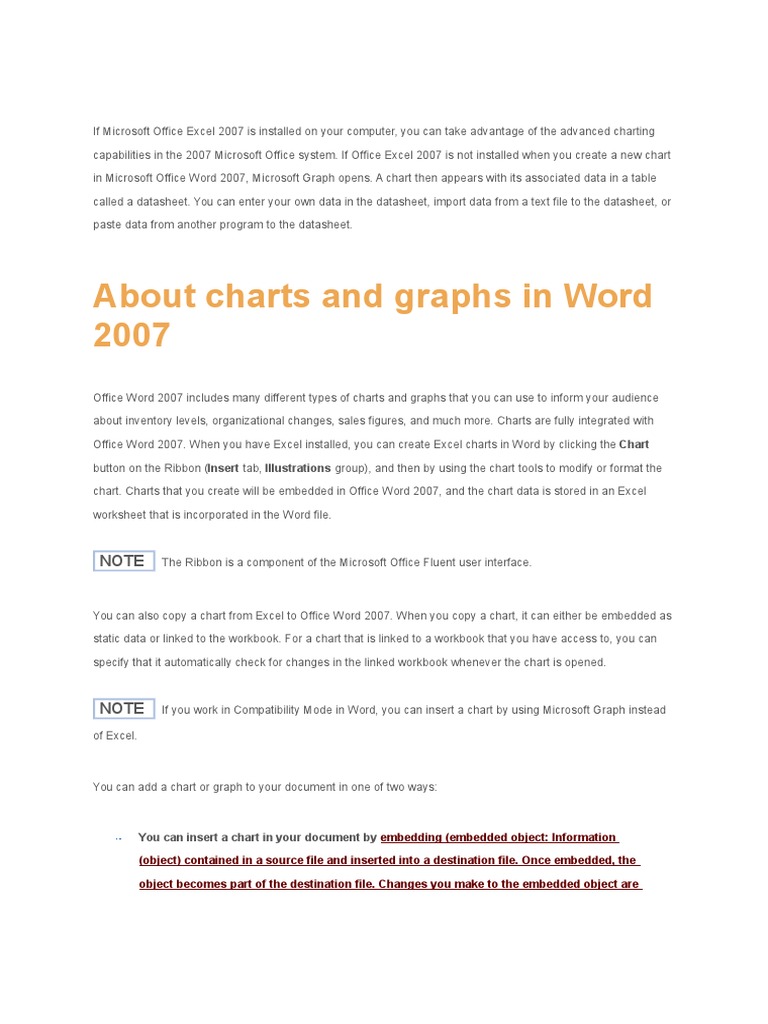 chart. Charts that you create will be embedded in Office Word 2007, and the chart data is stored in an Excel