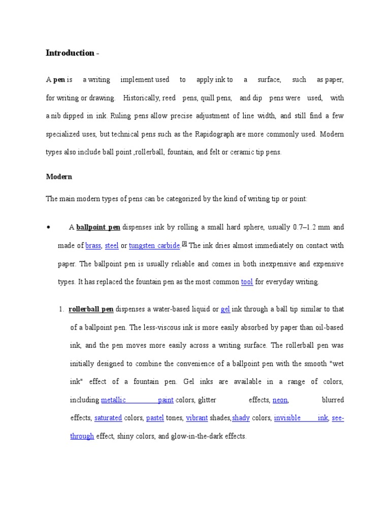 for writing or drawing. Historically, reed pens, quill pens, and dip pens were used, with