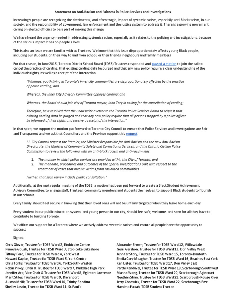 Statement on Anti-Racism and Fairness in Police Services and Investigations signed by Toronto District School Board (TDSB) Trustees, on Wednesday March 30th 2016.