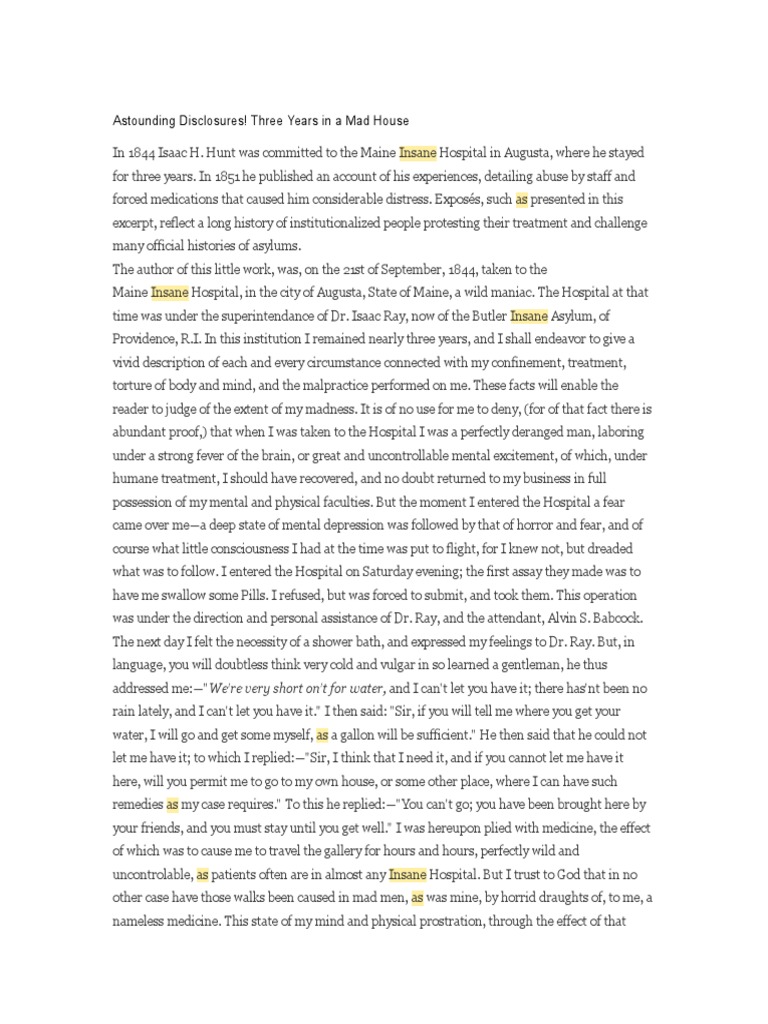 In 1844 Isaac H. Hunt was committed to the Maine Insane Hospital in Augusta, where he stayed