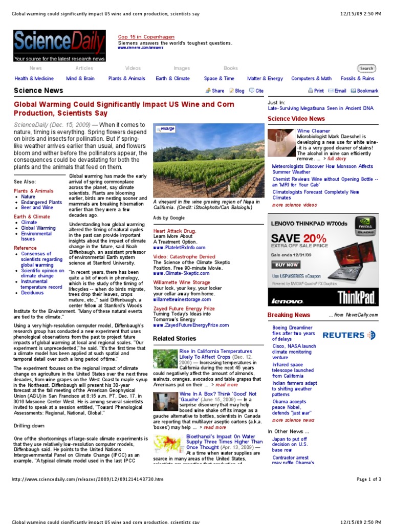 Global warming could significantly impact US wine and corn production, scientists say 12/15/09 2:50 PM
