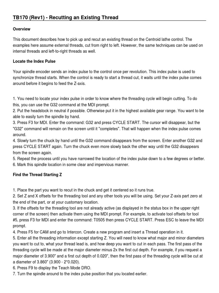 This document describes how to pick up and recut an existing thread on the Centroid lathe control. The