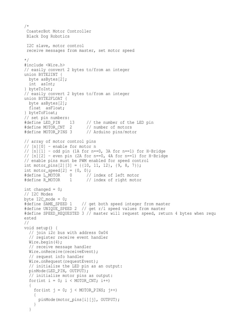 digitalWrite(motor_pins[motorIdx][1], HIGH);digitalWrite(motor_pins[motorIdx][2], LOW);}// set analog output to start motor - doneanalogWrite(motor_pins[motorIdx][0], pwmValue);}//// set both motors to same speed in 1 call for convinience//void setBothMotors(int motorSpd){for(int i = 0; i < MOTOR_CNT; i++){setMotorSpeed(i, motorSpd);}}//// I2C slave receive event handler// registered in setup()//// byteCnt is the number of bytes received from master// first byte is mode, determines how many to follow and what they mean// mode 1 - set both motors to same speed. 2 bytes (1 int) for speed follows// mode 2 - set motors to individual speeds. 4 bytes (2 int) for r, l speeds followsvoid receiveEvent(int byteCnt) {I2C_mode = Wire.receive();// convert bytes to ints easily using defined unionBYTE2INT received;// int storage bufferint intReceived[4] = {0, 0, 0, 0};switch(I2C_mode){// set both motors to same speed// 2 bytes representing integer speed followcase(SAME_SPEED):received.asBytes[0] = Wire.receive();received.asBytes[1] = Wire.receive();setBothMotors(received.asInt);changed = 1;break;//// set motors to different speeds// 4 bytes representing 2 integer speeds (right, left) followcase(UNIQUE_SPEED):received.asBytes[0] = Wire.receive();received.asBytes[1] = Wire.receive();intReceived[0] = received.asInt;received.asBytes[0] = Wire.receive();received.asBytes[1] = Wire.receive();intReceived[1] = received.asInt;setBothMotors(received.asInt);setMotorSpeed(R_MOTOR, intReceived[0]);setMotorSpeed(L_MOTOR, intReceived[1]);changed = 1;break;// next master request is for motor speedscase(SPEED_REQUESTED):changed = 1;break;