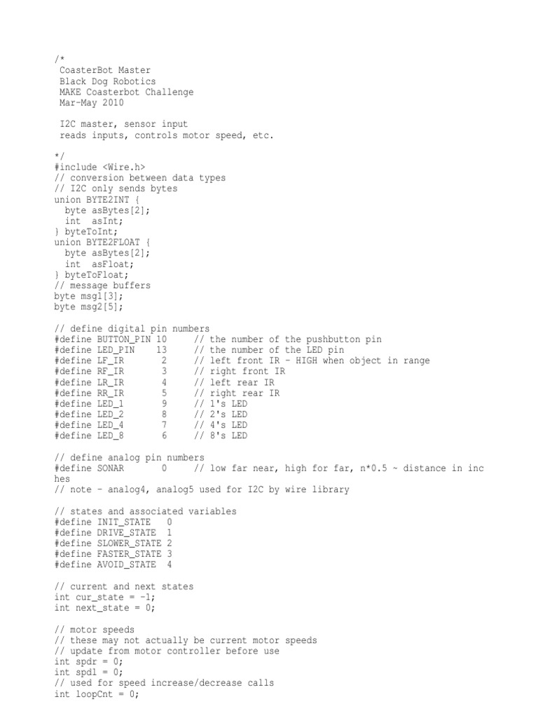 /*CoasterBot MasterBlack Dog RoboticsMAKE Coasterbot ChallengeMar-May 2010I2C master, sensor inputreads inputs, controls motor speed, etc.*/#include <Wire.h>// conversion between data types// I2C only sends bytesunion BYTE2INT {byte asBytes[2];int asInt;} byteToInt;union BYTE2FLOAT {byte asBytes[2];int asFloat;} byteToFloat;// message buffersbyte msg1[3];byte msg2[5];// define digital pin numbers#define BUTTON_PIN 10 // the number of the pushbutton pin#define LED_PIN 13 // the number of the LED pin#define LF_IR 2 // left front IR - HIGH when object in range#define RF_IR 3 // right front IR#define LR_IR 4 // left rear IR#define RR_IR 5 // right rear IR#define LED_1 9 // 1's LED#define LED_2 8 // 2's LED#define LED_4 7 // 4's LED#define LED_8 6 // 8's LED// define analog pin numbers#define SONAR 0 // low far near, high for far, n*0.5 ~ distance in inches// note - analog4, analog5 used for I2C by wire library// states and associated variables#define INIT_STATE 0#define DRIVE_STATE 1#define SLOWER_STATE 2#define FASTER_STATE 3#define AVOID_STATE 4// current and next statesint cur_state = -1;int next_state = 0;// motor speeds// these may not actually be current motor speeds// update from motor controller before useint spdr = 0;int spdl = 0;// used for speed increase/decrease callsint loopCnt = 0;