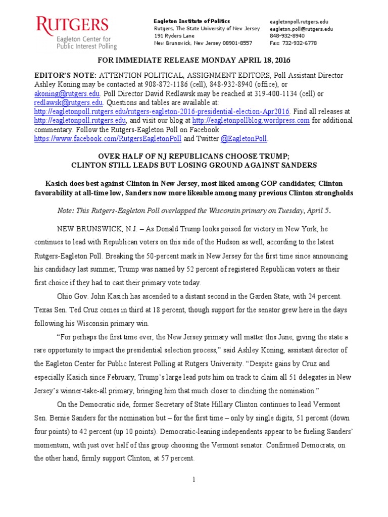 Rutgers Eagleton Poll - New Jersey Primary 04-18-16