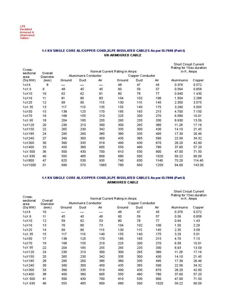 1.1 KV SINGLE CORE AL/COPPER COND,XLPE INSULATED CABLES As per IS:7098 (Part-I)