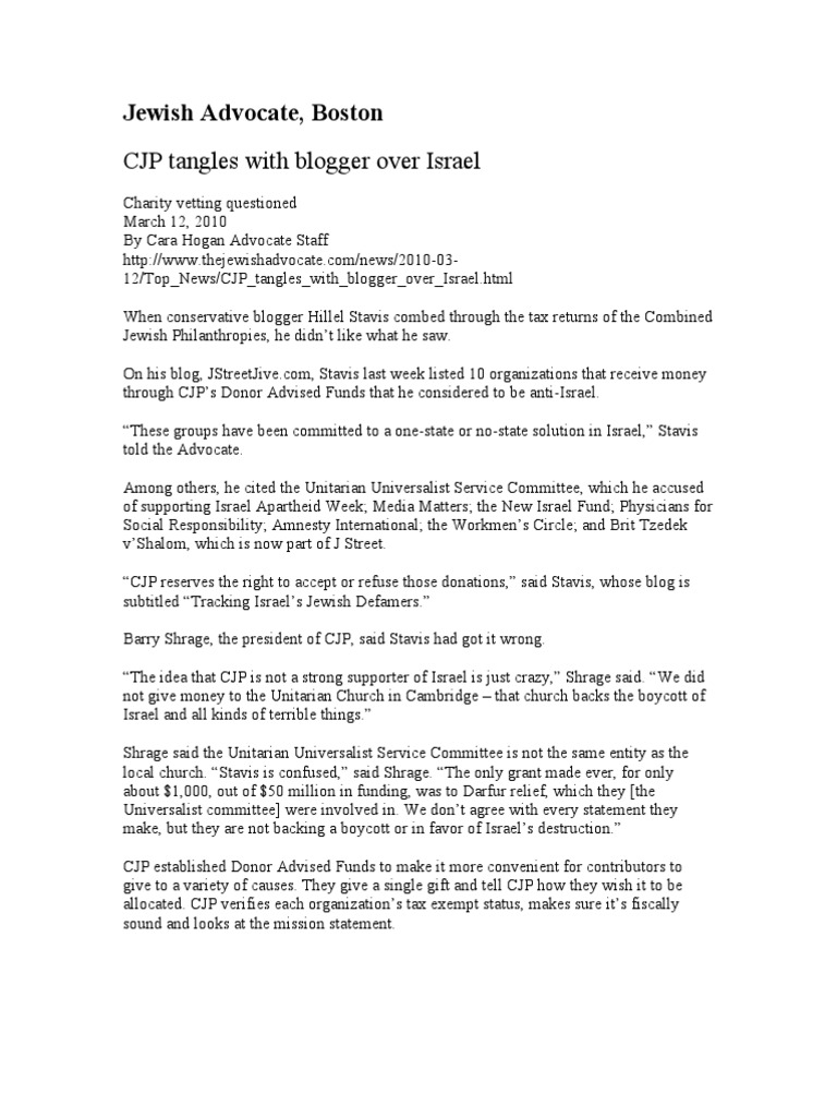 A conservative blogger criticized the Combined Jewish Philanthropies (CJP) for providing funding through its Donor Advised Funds to organizations he considered anti-Israel. The blogger listed 10 such organizations, including the Unitarian Universalist Service Committee and New Israel Fund. CJP's president defended the vetting process for organizations and said funding only went to legitimate activities, not anti-Israel work. However, some argued CJP should be more discerning about indirectly supporting groups critical of some Israeli policies through these funds. The debate touched on tensions between supporting Israel and maintaining an inclusive Jewish community.
