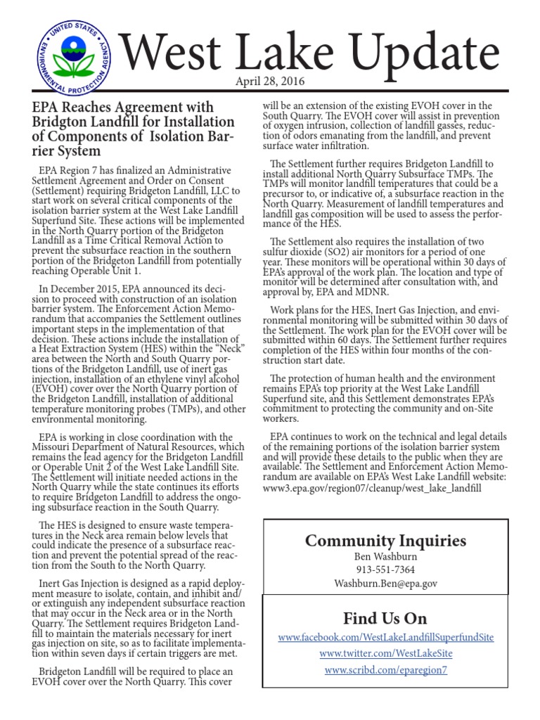 EPA Region 7 has finalized an Administrative Settlement Agreement and Order on Consent (Settlement) requiring Bridgeton Landfill, LLC to start work on several critical components of the isolation barrier system at the West Lake Landfill Superfund Site. These actions will be implemented in the North Quarry portion of the Bridgeton Landfill as a Time Critical Removal Action to prevent the subsurface reaction in the southern portion of the Bridgeton Landfill from potentially reaching Operable Unit 1.