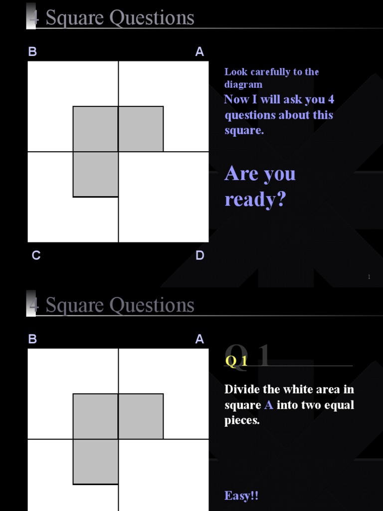The document presents a series of 4 square questions that ask the reader to visually divide the white areas of 4 labeled squares (A, B, C, D) into an increasing number of equal pieces. For each question, the document provides feedback and encouragement to the reader to solve the problem, then reveals the answer. The final question challenges the reader to divide square D into 7 equal pieces in under 7 seconds. The document concludes by stating its purpose was to observe how the mind can be conditioned.