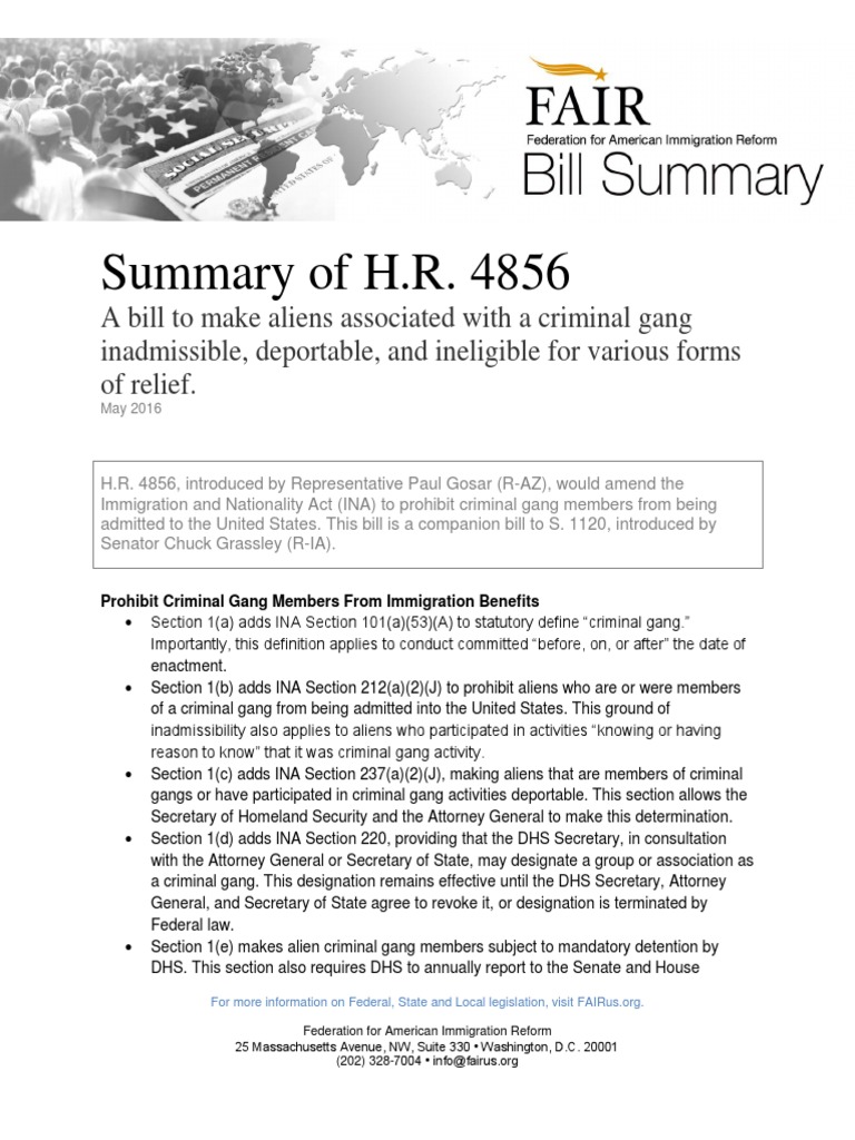 H.R. 4856, introduced by Representative Paul Gosar (R-AZ), would amend the Immigration and Nationality Act (INA) to prohibit criminal gang members from being admitted to the United States. This bill is a companion bill to S. 1120, introduced by Senator Chuck Grassley (R-IA).