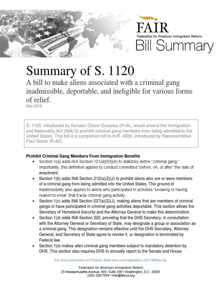 S. 1120, introduced by Senator Chuck Grassley (R-IA), would amend the Immigration and Nationality Act (INA) to prohibit criminal gang members from being admitted to the United States. This bill is a companion bill to H.R. 4856, introduced by Representative Paul Gosar (R-AZ).