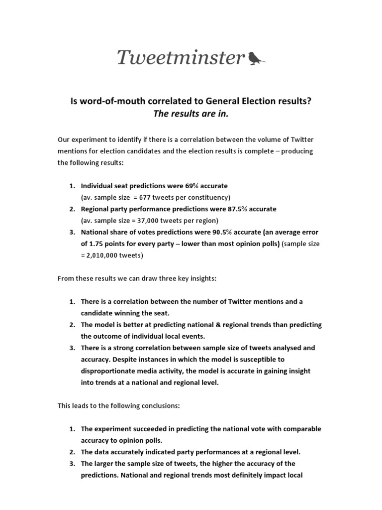 The complete set of findings of Tweetminster's study into correlations between word-of-mouth on Twitter and election results.