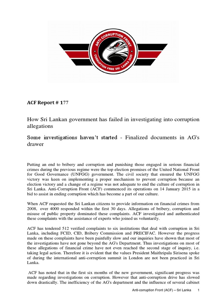 Sri Lanka. Anti-Corruption Front (ACF) commenced its operations on 14 January 2015 in a