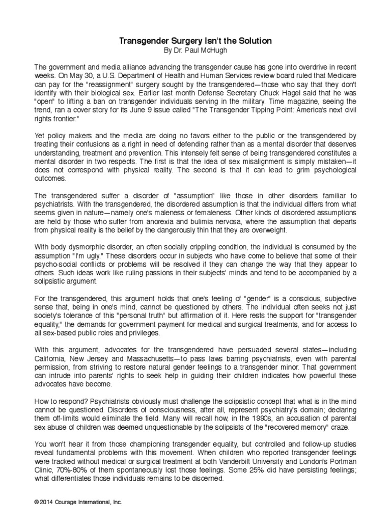 arguments against having transgender surgery. Treatments here must begin with removing the young