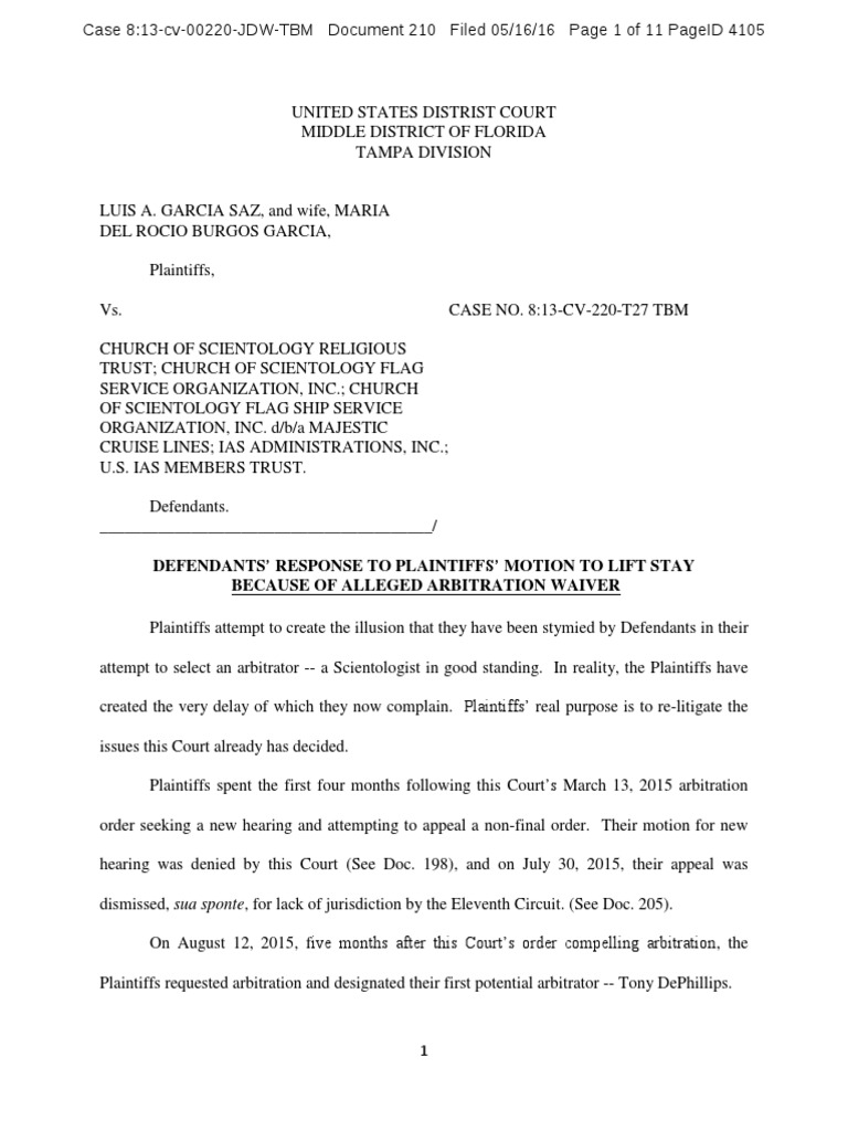 UNITED STATES DISTRIST COURT MIDDLE DISTRICT OF FLORIDA TAMPA DIVISION LUIS A. GARCIA SAZ, and wife, MARIA DEL ROCIO BURGOS GARCIA, Plaintiffs, Vs. CASE NO. 8:13-CV-220-T27 TBM CHURCH OF SCIENTOLOGY RELIGIOUS TRUST; CHURCH OF SCIENTOLOGY FLAG SERVICE ORGANIZATION, INC.; CHURCH OF SCIENTOLOGY FLAG SHIP SERVICE ORGANIZATION, INC. d/b/a MAJESTIC CRUISE LINES; IAS ADMINISTRATIONS, INC.; U.S. IAS MEMBERS TRUST. Defendants. ________________________________________/