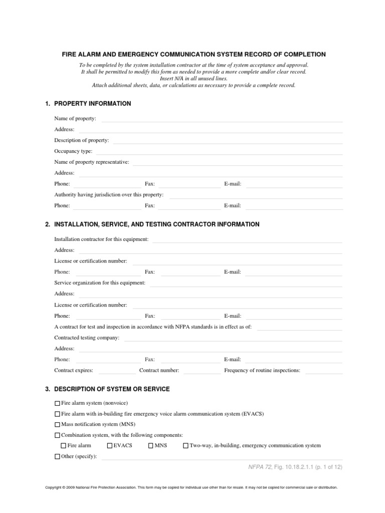 FIRE ALARM AND EMERGENCY COMMUNICATION SYSTEM RECORD OF COMPLETION
