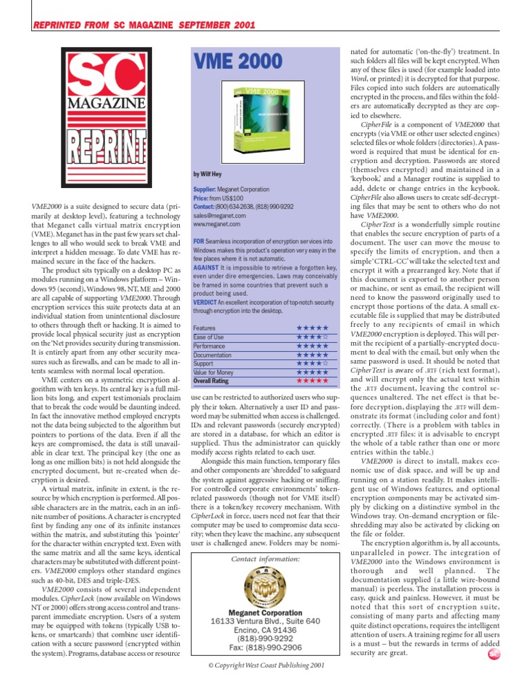 VME2000 is a suite designed to secure data (pri- Contact: (800) 634-2638, (818) 990-9292 ing files that may be sent to others who do not