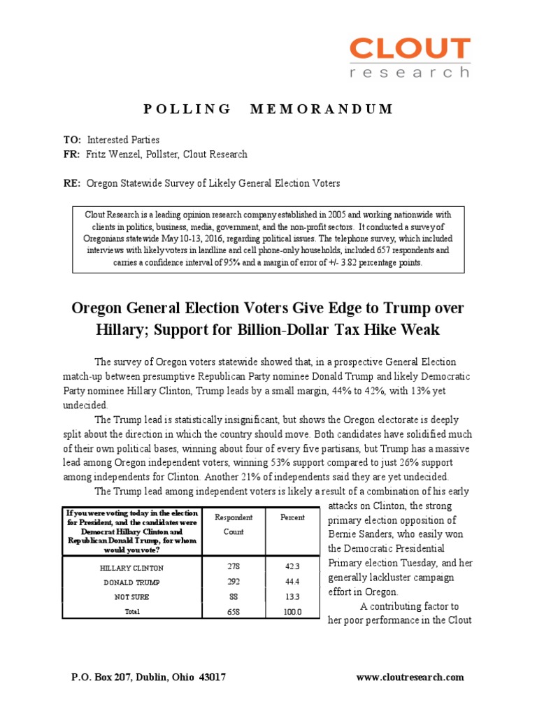 The survey of Oregon voters statewide showed that, in a prospective General Election match-up between presumptive Republican Party nominee Donald Trump and likely Democratic Party nominee Hi…
