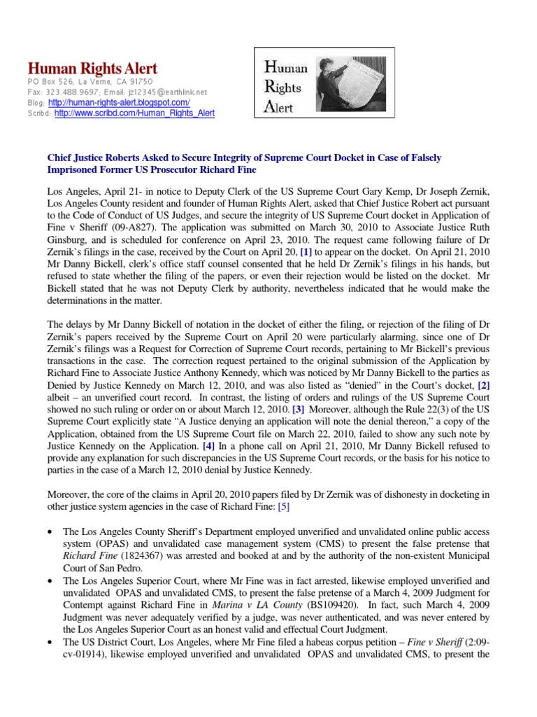 Los Angeles, April 21- in notice to Deputy Clerk of the US Supreme Court Gary Kemp, Dr Joseph Zernik, Los Angeles County resident and founder of Human Rights Alert, asked that Chief Justice Robert act pursuant to the Code of Conduct of US Judges, and secure the integrity of US Supreme Court docket in Application of Fine v Sheriff (09-A827). The application was submitted on March 30, 2010 to Associate Justice Ruth Ginsburg, and is scheduled for conference on April 23, 2010. The request came following failure of Dr Zernik’s filings in the case, received by the Court on April 20,