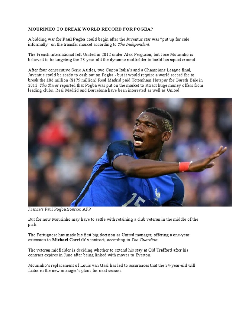 2013. The Times reported that Pogba was put on the market to attract huge money offers from