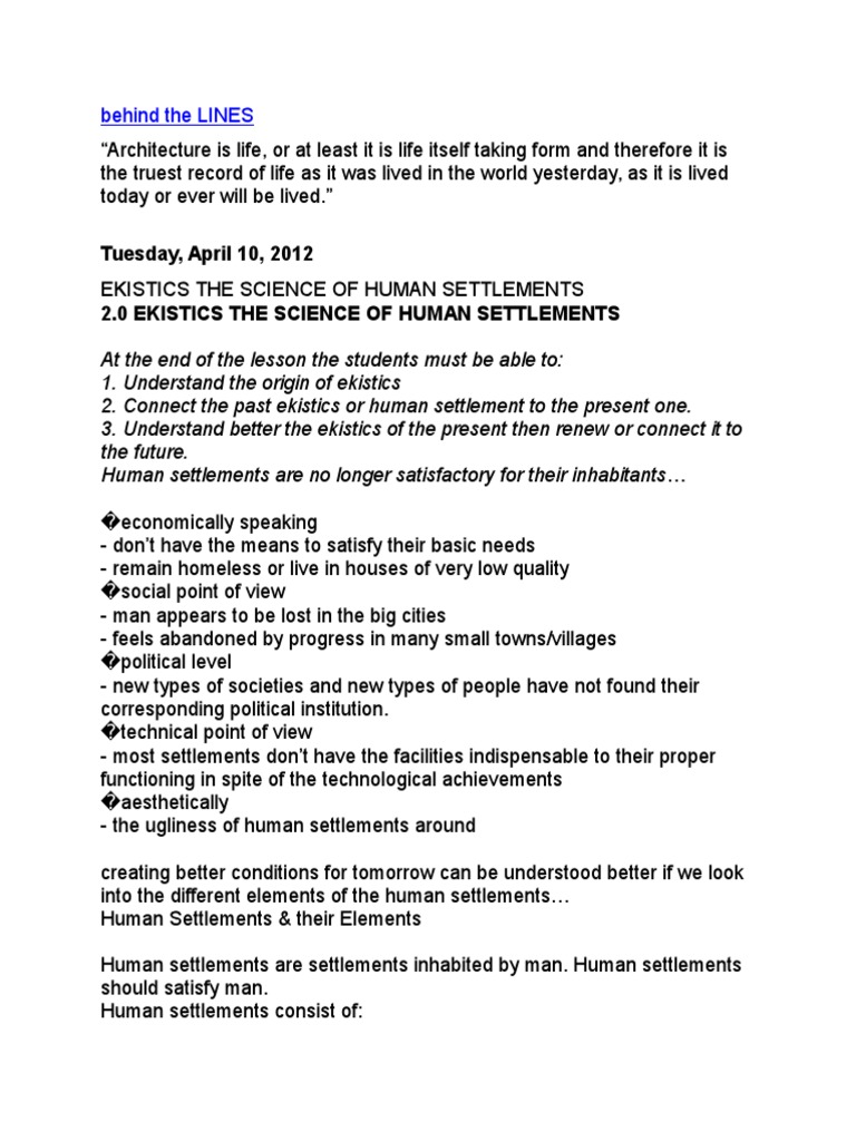 2.0 EKISTICS THE SCIENCE OF HUMAN SETTLEMENTS