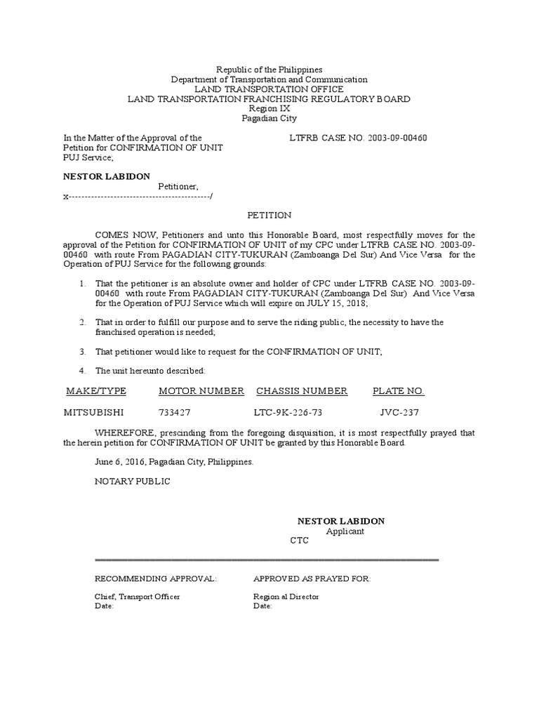 approval of the Petition for CONFIRMATION OF UNIT of my CPC under LTFRB CASE NO. 2003-0900460 with route From PAGADIAN CITY-TUKURAN (Zamboanga Del Sur) And Vice Versa for the