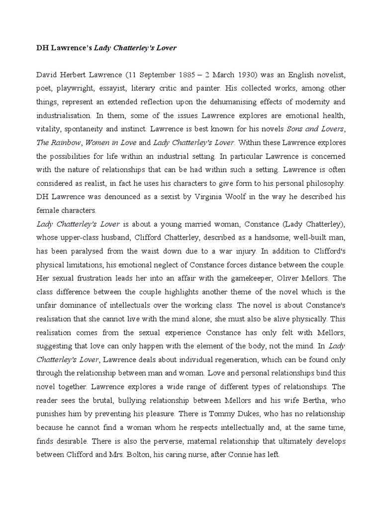 The Rainbow, Women in Love and Lady Chatterley's Lover. Within these Lawrence explores
