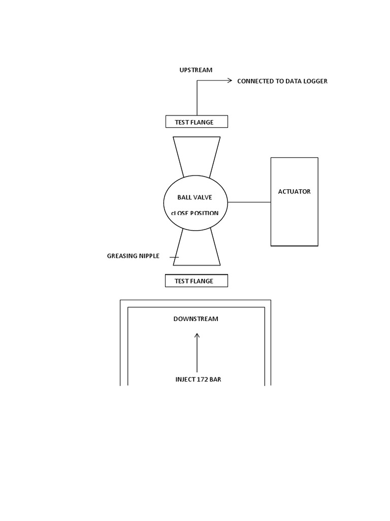 The document describes a test setup that includes an upstream connection to a data logger, a test flange, ball valve in the closed position, greasing nipple, second test flange, and downstream section. The test involves injecting 172 bar of pressure through the setup using an actuator.