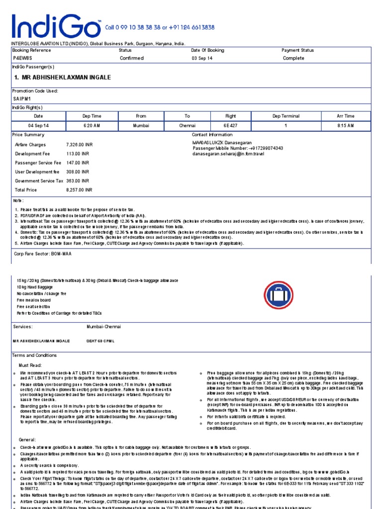 This booking is governed by IndiGo's fare rules and Conditions of Carriage that are available from Airport Counters, IndiGo Shops or w w w .[Link]
